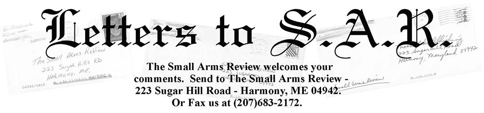 We get asked by many of the readers how they can help. Our stated goal is to make this a stable, long term platform for our common interests. There are three ways you can help. First- fax, mail, or email us with the things you want more coverage of, we have a list and are supplying it to the writers to work from. Second- if you see something advertised in here, and call the advertiser, let them know you saw it in SAR- we need to keep our advertisers aware of what their exposure here does. Third- if you are a newsstand buyer and have to travel to get SAR, ask for “The Small Arms Review” at your local newsstand. All of these will help us with our base building.