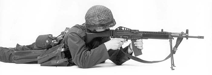 Stoner 63A1 “Dutch” Stoner in rifle configuration in the bipod supported, prone position.