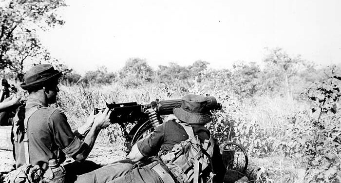 A Vicker’s MMG crew from the Pretoria Regiment, a Citizen Force unit equivalent to the U.S. Army National Guard or Reserve, in training along the border, 1979. Supporting troops are armed with South African-made 7.62mm FN FALs, known as R-1’s (SANDF Photo Service)