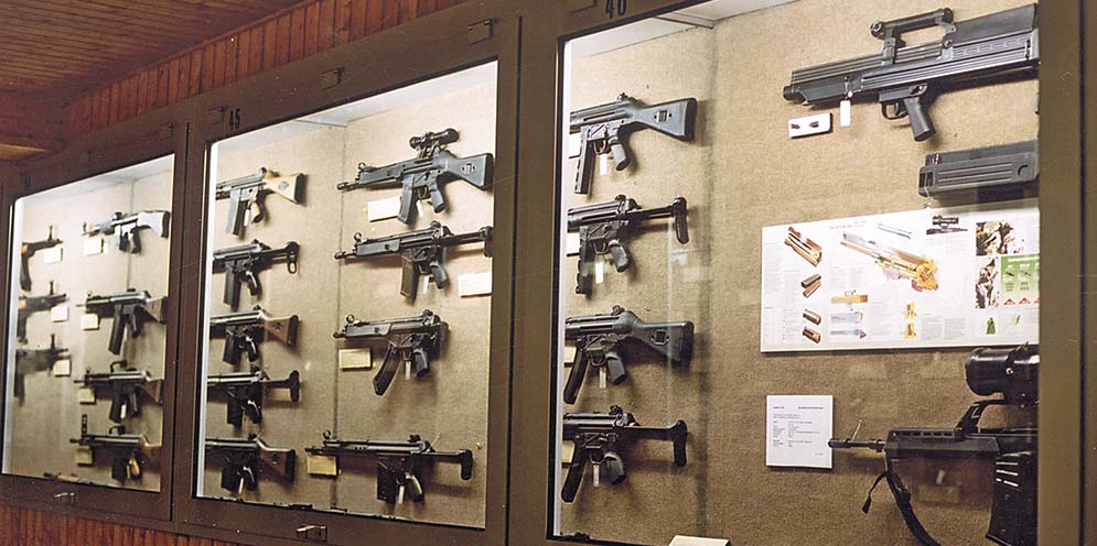 Behind lighted cases is an impressive Heckler & Koch weapons display. The entire family of the G3 up to the G36 and the MP5 series can be seen. Also included is the G11. WWI and WWII belt fed machine guns are also on display along with an impressive collection of vintage aircraft guns.